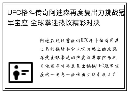 UFC格斗传奇阿迪森再度复出力挑战冠军宝座 全球拳迷热议精彩对决