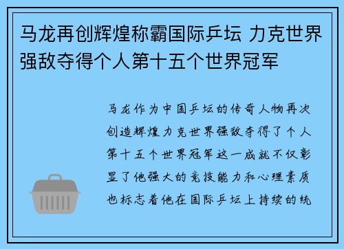 马龙通过持续的努力与突破,最终实现了自己的第十五个世界冠军的伟大成就。这一成就不仅是他个人职业生涯的巅峰,也是中国乒乓球的历史性时刻。马龙的成功,得益于他无与伦比的技战术水平和强大的心理素质。在未来,马龙仍然是国际乒坛不可忽视的力量,他的辉煌故事将继续激励着无数年轻选手。