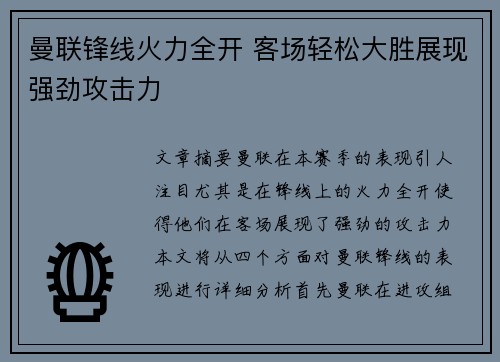 曼联在本赛季的表现引人注目,尤其是在锋线上的火力全开,使得他们在客场展现了强劲的攻击力。本文将从四个方面对曼联锋线的表现进行详细分析。首先,曼联在进攻组织方面的变化和效率提升,让他们能够更好地利用场上空间并发挥出球员的技术优势;其次,球队的前锋组合默契十足,通过高效的跑位和配合完成了大量进球;再者,曼联锋线球员的个人能力爆发,尤其是在面对对手防线时的突破和创造机会的能力,让球队在客场比赛中能够轻松大胜;最后,球队的进攻多样化和战术选择更加灵活,给对手带来了巨大的压力,确保了他们在竞争激烈的英超赛场中保持竞争力。通过这四个方面的详细分析,本文将全面阐述曼联锋线火力全开的表现及其在比赛中的关键作用。