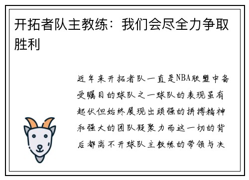 开拓者队的主教练所展现出来的信心与决心,给整个球队注入了新的活力,也让球迷们看到了更加光明的未来。未来的比赛,开拓者队必定会在主教练的带领下,继续拼搏,不断进步。