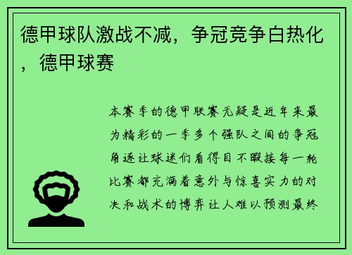 德甲球队激战不减,争冠竞争白热化,德甲球赛