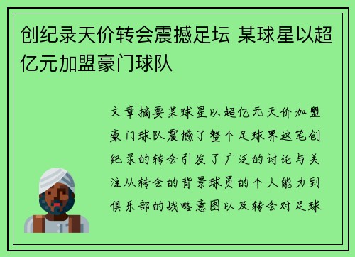 创纪录天价转会震撼足坛 某球星以超亿元加盟豪门球队